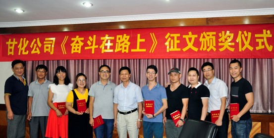 2018年8月17日下午,在甘化大廈15樓會議室,公司黨委、工會舉辦《奮斗在路上》獲獎?wù)魑念C獎儀式。本次活動共收到征文11篇,參賽征文經(jīng)專業(yè)評委評選,獲獎10篇。公司各支部委員、工會委員和征文作者共16人參加了會議。