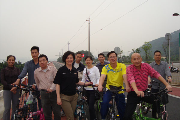 經(jīng)過(guò)大約半小時(shí)的路程,我們來(lái)到了濱江綠道租車(chē)處,精心挑選了自己喜歡的自行車(chē),迫不及待地騎上試試。綠道上,我們歡笑著排成一排,合照留影。只等小組長(zhǎng)發(fā)出“出發(fā)”的命令。“走”,在小組長(zhǎng)的發(fā)號(hào)聲中,一輛輛自行車(chē)像離弦的箭一樣向前飛馳。我們奔馳在寬闊的綠道上,你追我趕,享受著大自然的美麗,灑下一路的歡聲笑語(yǔ)。雨后潮濕的路面并沒(méi)有減弱我們的激情,相反雨后的清新反而給我們帶來(lái)了別樣的風(fēng)景和舒暢的心情。綠道旁邊的公園在雨后顯得特別有生氣,一排排的花草樹(shù)木在我們面前掠過(guò)。一陣風(fēng)吹來(lái),樹(shù)葉發(fā)出“沙沙”的響聲,仿佛唱著一首首輕快的歌,歡迎我們的到來(lái),讓我們領(lǐng)略了綠道散發(fā)出的迷人魅力。車(chē)隊(duì)駐足于此,“快門(mén)”記錄了我們迷人的微笑和綠道的文化名片。