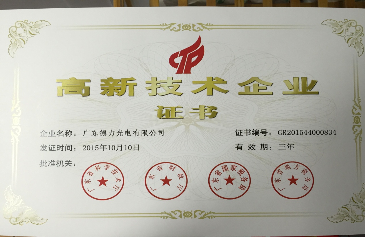 2016年3月25日德力光電收到廣東省科學(xué)技術(shù)廳、廣東省財(cái)政廳、廣東省國(guó)家稅務(wù)局、廣東省地方稅務(wù)局聯(lián)合頒發(fā)的《高新技術(shù)企業(yè)證書》。這是對(duì)德力光電科研成果及技術(shù)創(chuàng)新的認(rèn)可,是企業(yè)科技實(shí)力及持續(xù)創(chuàng)新能力的證明。